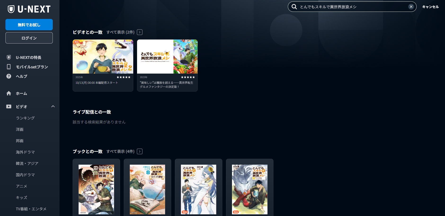 とんでもスキルで異世界放浪メシ全シーズンだけでなく、人気テレビ番組・アニメ・バラエティ・ドラマ・音楽番組・歌番組・人気アーティストのMV/ライブ映像・お笑い系・ライブ・映画などを観たい方はU-NEXTで無料フル視聴できますよ!