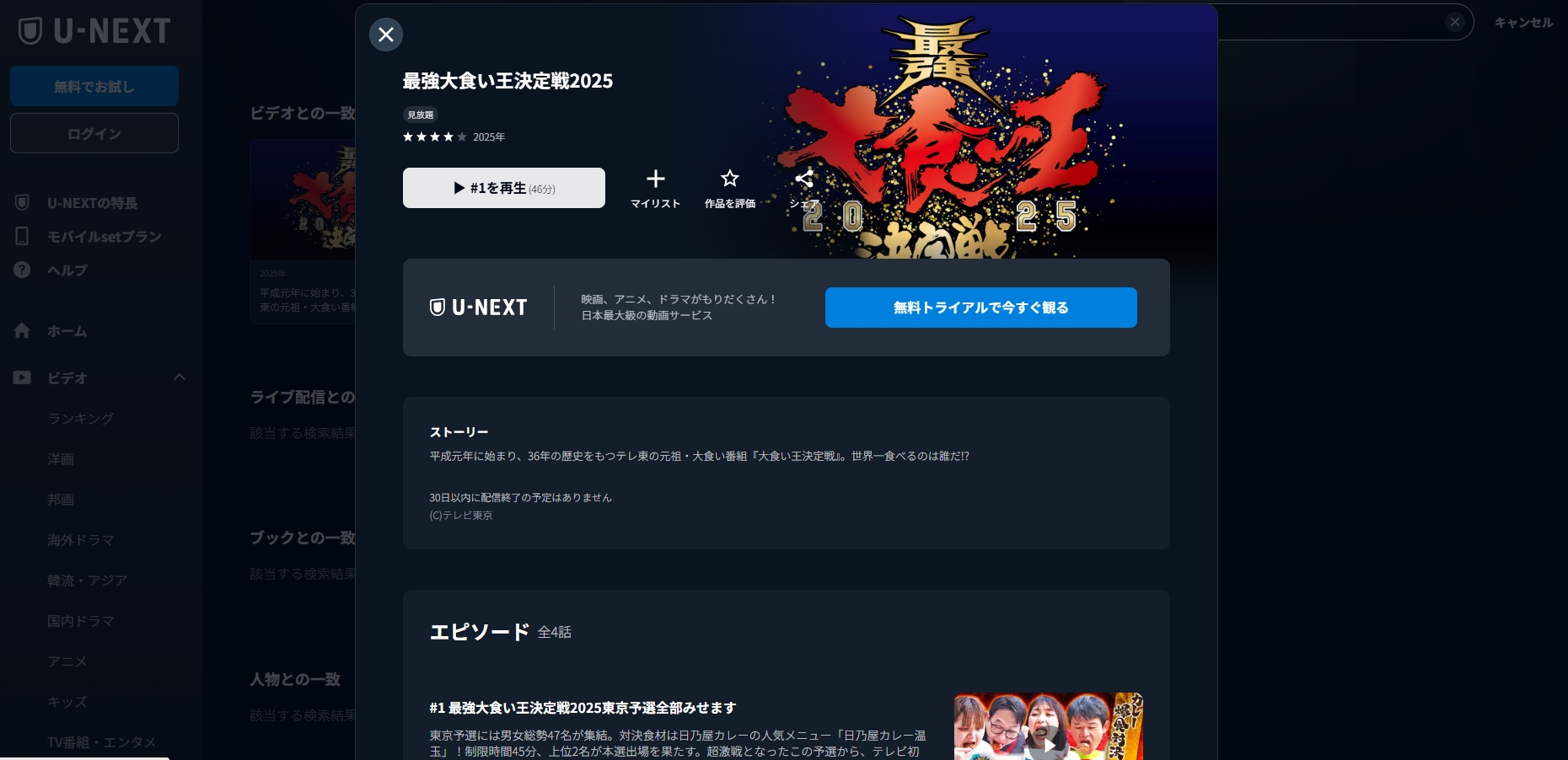最強大食い王決定戦だけでなく、人気テレビ番組・トーク番組・バラエティ番組・音楽系・MV・お笑い系・ライブ・アニメ・映画・ドラマなどを観たい方はU-NEXTで視聴できますよ!
