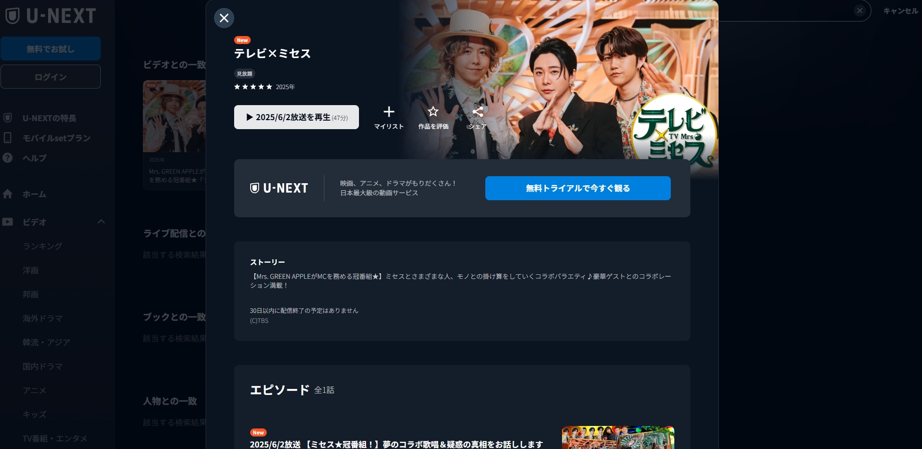 テレビ×ミセスの過去放送~最新放送だけでなく、人気テレビ番組・クイズ番組・映画・ドラマ・アニメの1話~最新話のフル視聴(見逃し配信)や原作はこちら!