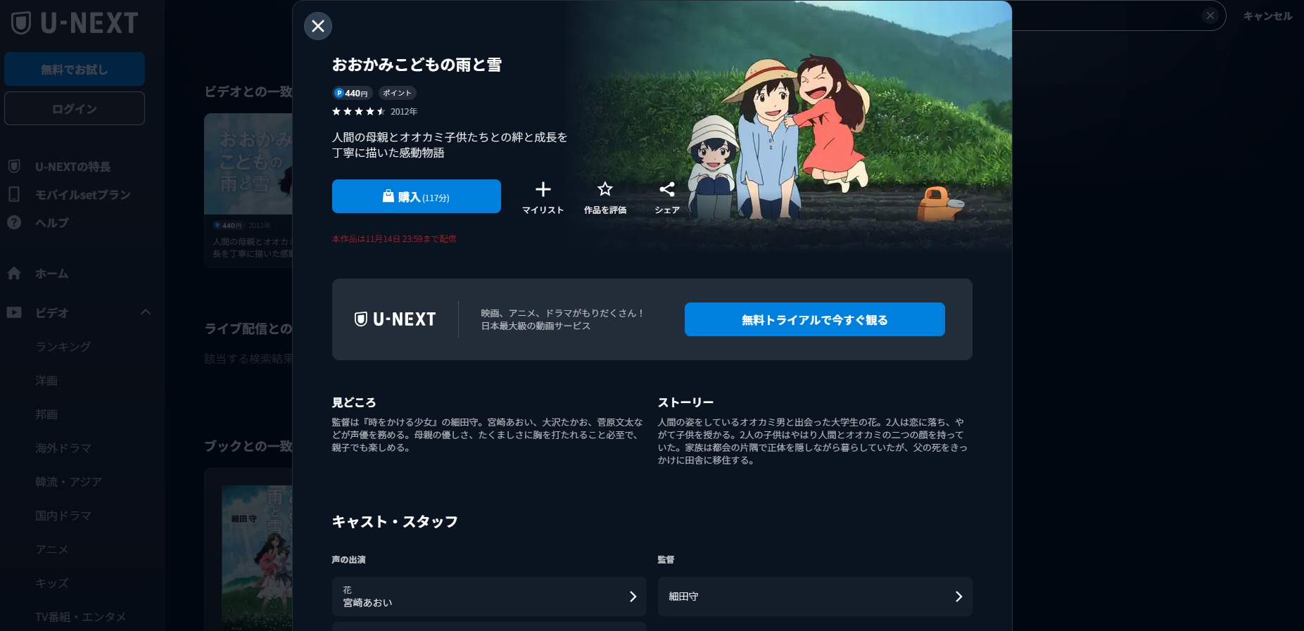 おおかみこどもの雨と雪だけでなく、人気バラエティ・音楽系・MV・お笑い系・ライブ・アニメ・映画・ドラマなどを観たい方はU-NEXTで視聴できますよ!