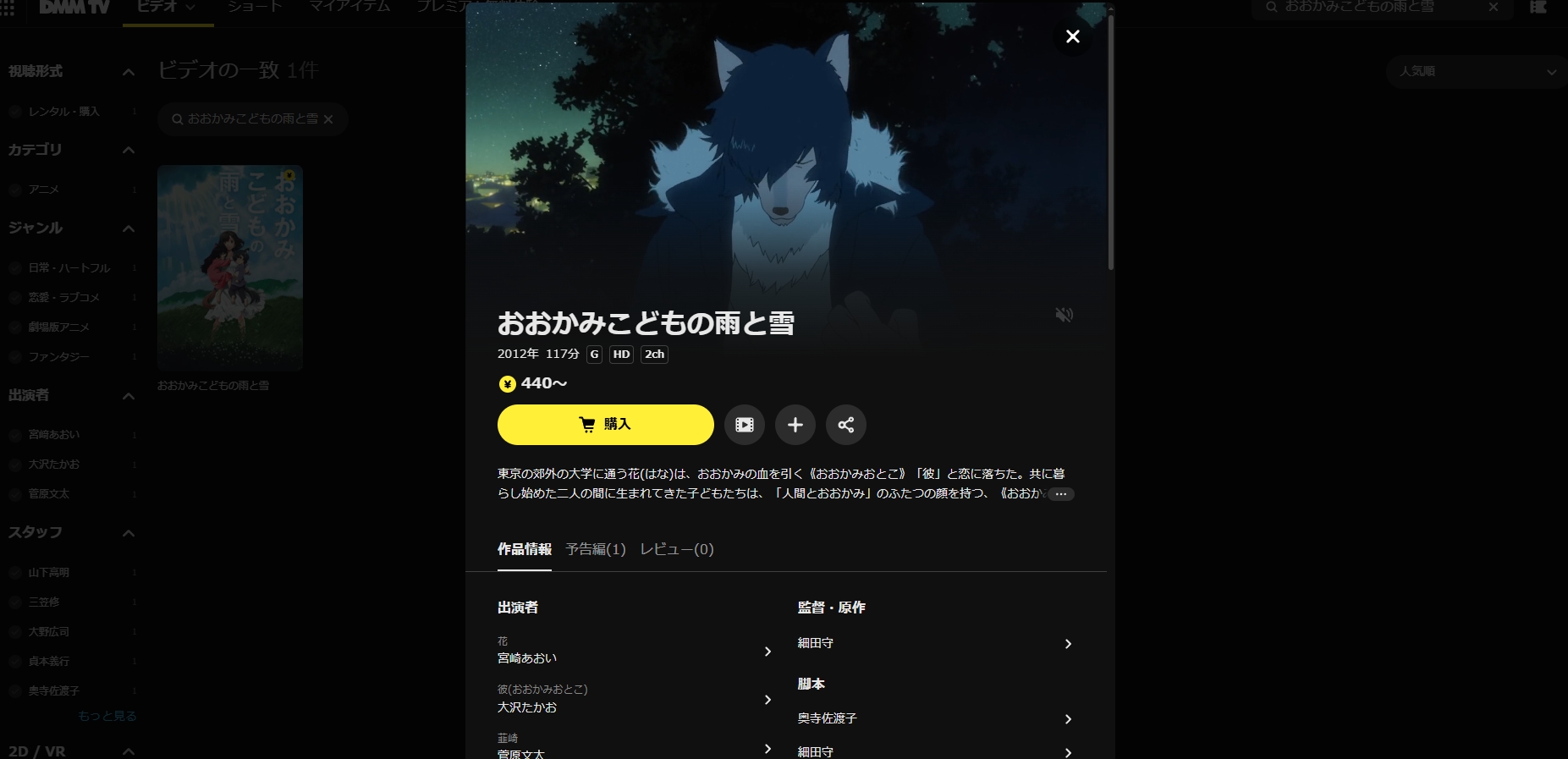 ↓↓サおおかみこどもの雨と雪はDMMTVとauスマートパスプレミアム公式サイト(スマホ専用/au以外もOK!)とU-NEXTとmieruTV or Hulu で無料フル視聴しましょう↓↓