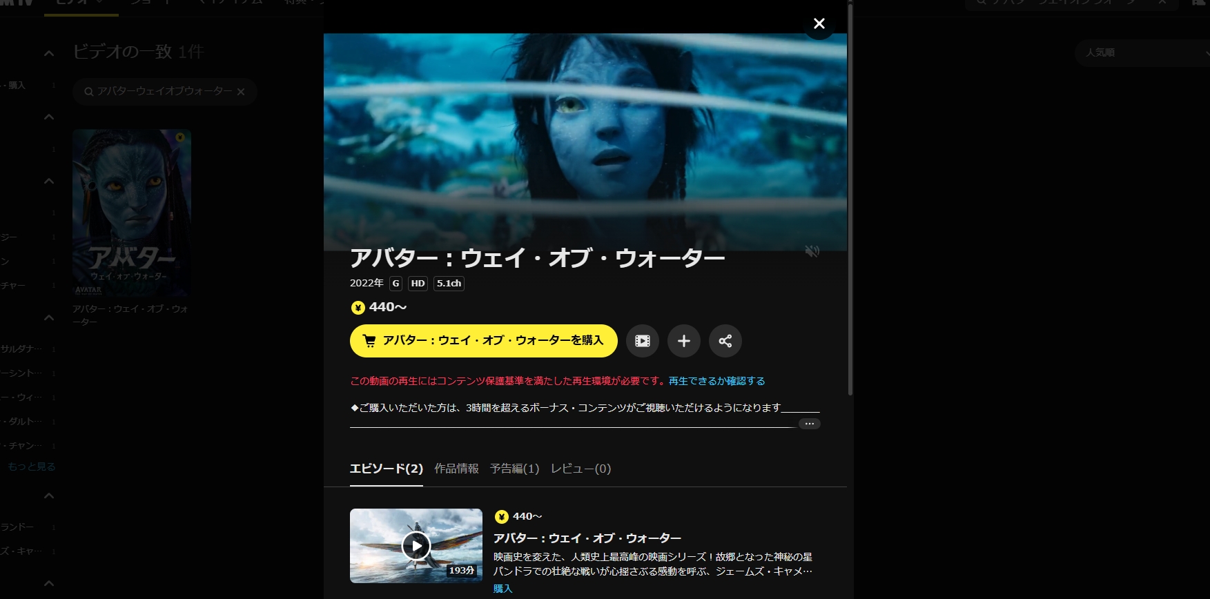 アバターウェイオブウォーターの動画を探しましたが、みつかりませんでした。