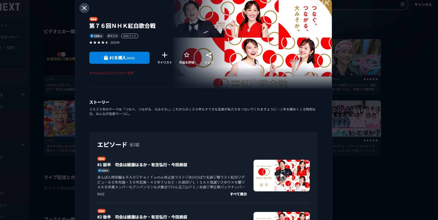 NHK紅白歌合戦だけでなく、人気テレビ番組・音楽番組・歌番組・スポーツ・バラエティ・映画・アニメ・ドラマの無料フル視聴(見逃し配信)はこちら!