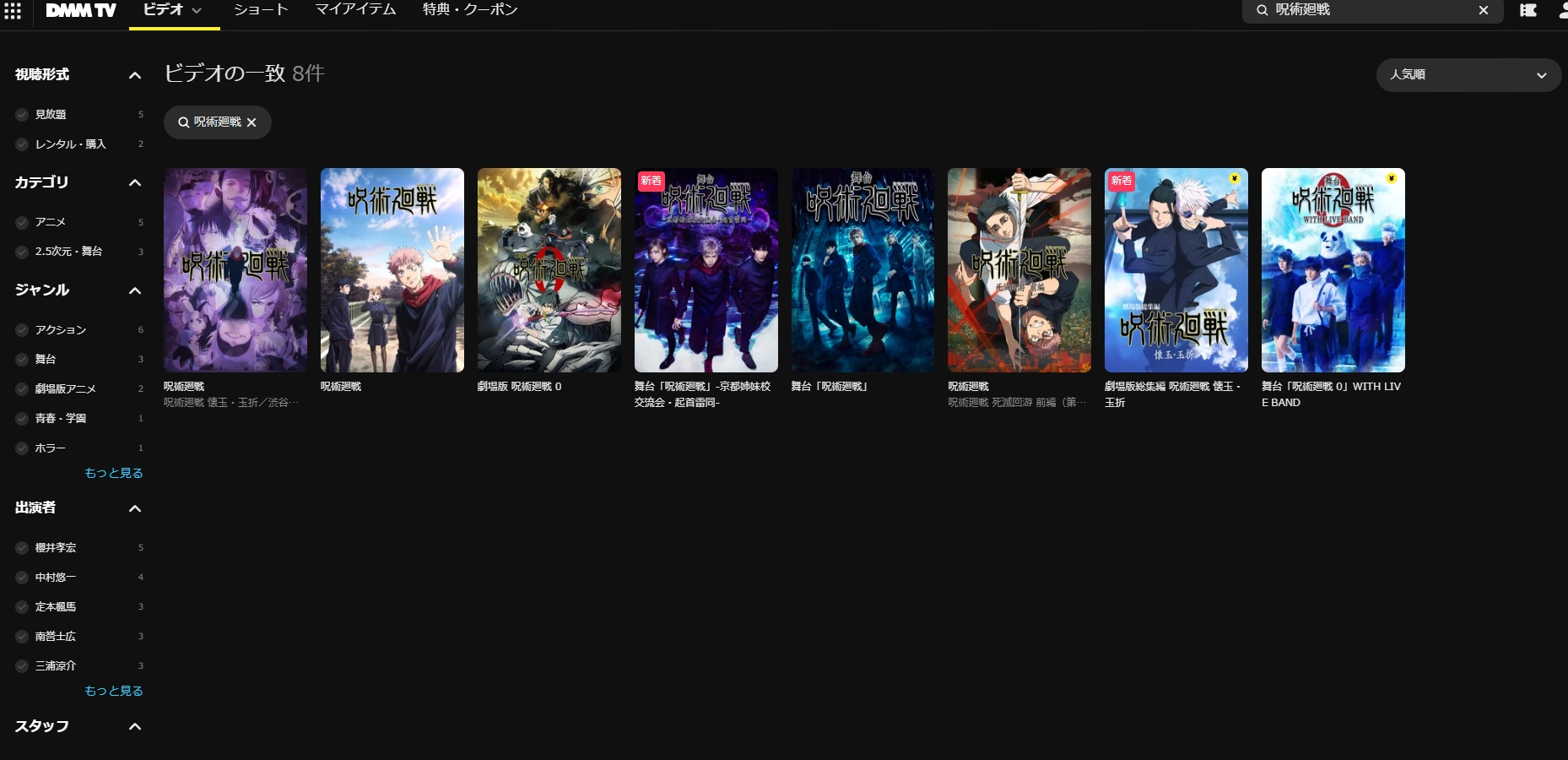 DMMTVなら呪術廻戦全シーズンだけでなく、人気のテレビ番組、アニメ、バラエティ、音楽・歌、スポーツ、ドラマ、映画、エンタメ、駅伝、マラソン、2.5次元舞台、特撮、アイドル、グラビア、アダルト作品などを観れます!(アダルト作品は18歳未満は閲覧できません)